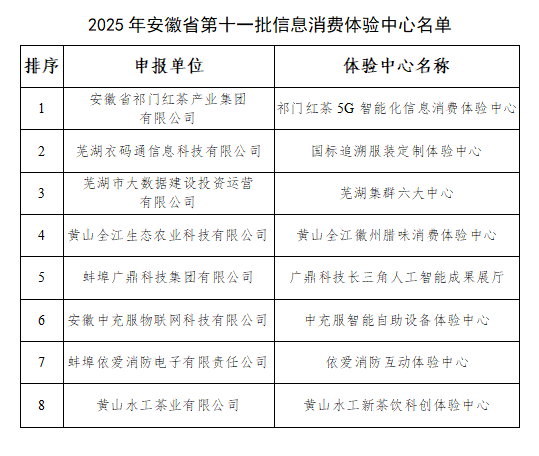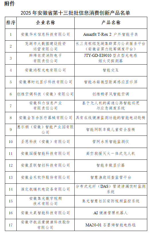 安徽省工业和信息化厅关于公布安徽省第十三批信息消费创新产品和第十一批信息消费体验中心名单的通知各市工信局: 根据安徽省工业和信息化厅《关于组织申报安徽省第十三批信息消费创新产品和第十一批信息消费体验中心的通知》,经各市工信局上报推荐、专家评审等程序,确定安徽华米信息科技有限公司“Amazfit T-Rex2户外智能手”等22个产品为安徽省第十三批信息消费创新产品,安徽省祁门红茶产业集团有限公司“祁门红茶5G智能化信息消费体验中心”等8个体验中心为安徽省第十一批信息消费体验中心,现予公布。 附件:安徽省第十三批信息消费创新产品和第十一批信息消费体验中心名单 安徽省工业和信息化厅 2025年9月22日 ![]() ![]() ![]() |
