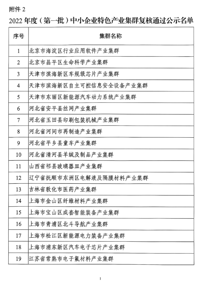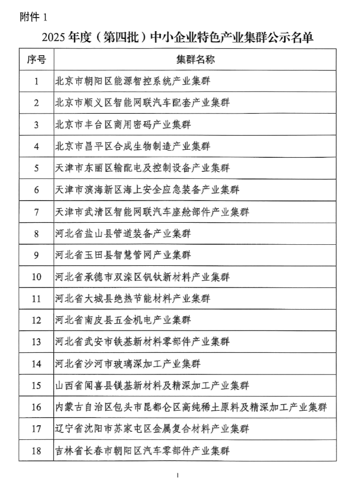 关于2025年度(第四批)中小企业特色产业集群名单和2022年度(第一批)中小企业特色产业集群复核通过名单的公示根据《促进中小企业特色产业集群发展暂行办法》(工信部企业〔2022〕119号)、《工业和信息化部办公厅关于组织开展2025年度中小企业特色产业集群推荐和2022年度中小企业特色产业集群复核工作的通知》(工信厅企业函〔2025〕77号),我们组织开展了2025年度(第四批)中小企业特色产业集群认定和2022年度(第一批)中小企业特色产业集群复核工作,通过省级中小企业主管部门初核和推荐、专家评审等程序,形成了《2025年度(第四批)中小企业特色产业集群公示名单》(100个)和《2022年度(第一批)中小企业特色产业集群复核通过公示名单》(97个)。现予以公示。 欢迎社会各界参与监督,如有异议,请实名反馈工业和信息化部中小企业局,并提供佐证材料和联系方式,以便核实查证。 公示时间:2025年9月24日至26日、9月28日至29日(5个工作日) 联系电话:010-68205727 附件:1.2025年度(第四批)中小企业特色产业集群公示名单 2.2022年度(第一批)中小企业特色产业集群复核通过公示名单 工业和信息化部中小企业局 2025年9月23日 ![]() ![]() ![]() ![]() ![]() ![]() ![]() ![]() ![]() ![]() ![]() |