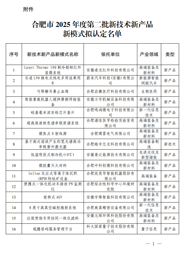 关于合肥市2025年度第二批新技术新产品新模式拟认定名单的公示根据《合肥市新技术新产品新模式认定及推广实施方案(试行)》(合科创委办〔2022〕16号)文件要求,市科技局组织开展了合肥市2025年度第二批新技术新产品新模式认定工作。经专家评审和会议研究,现将结果予以公示,公示期5个工作日(9月23日至9月28日)。 公示期间,如对公示名单有异议,任何单位或个人可向市科技局机关纪委提出。对公示名单提出异议,要以书面形式详细写明异议的内容和事实根据。以单位名义提出异议的,应写明单位负责人和联系人姓名,并加盖本单位公章;个人提出异议的,应写明本人真实姓名、工作单位、联系地址和方式。 联系单位:市科技局科技成果转化促进处 联系电话:0551-63537767 市科技局机关纪委电话:0551-63538658 附件:合肥市2025年度第二批新技术新产品新模式拟认定名单.pdf ![]() ![]() |