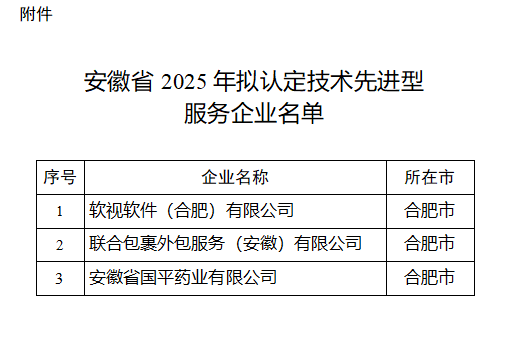 关于公示安徽省2025年拟认定技术先进型服务企业名单的通知各有关单位: 根据《安徽省技术先进型服务企业认定管理办法》(科高〔2018〕67号)有关规定,现将安徽省2025年拟认定技术先进型服务企业名单予以公示,公示期为5个工作日。任何单位或个人如对公示企业有异议,请于公示期内向安徽省技术先进型服务企业认定机构以实名、书面形式提出。对有异议企业的具体问题应有清楚表述,并需提供事实证据。对收到的异议,我们将严格按照相关规定办理。 联系部门:安徽省科技厅企业处电话:0551-62665113、62651782 通信地址:合肥市包河区安徽路1号609室 附件:安徽省2025年拟认定技术先进型服务企业名单.docx 2025年11月3日 ![]() |