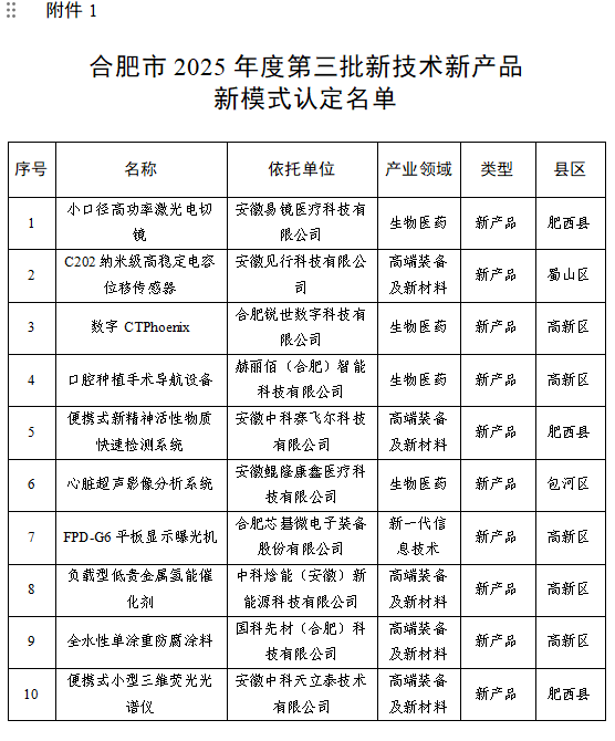 关于公布合肥市2025年度第三批新技术新产品新模式认定名单的通知各有关单位: 根据《合肥市新技术新产品新模式认定及推广实施方案(试行)》(合科创委办〔2022〕16号)文件精神,市科技局组织开展了合肥市2025年度第三批新技术新产品新模式认定工作。经专家评审和会议研究,并公示无异议后,现公布安徽易镜医疗科技有限公司“小口径高功率激光电切镜”等52个申报项目认定为合肥市2025年度第三批新技术新产品新模式,并纳入《合肥市“三新”产品推广应用目录》。 附件1:合肥市2025年度第三批新技术新产品新模式认定名单.docx 附件2:合肥市“三新”产品推广应用目录.docx 2026年1月14日 ![]() ![]() ![]() ![]() ![]() |