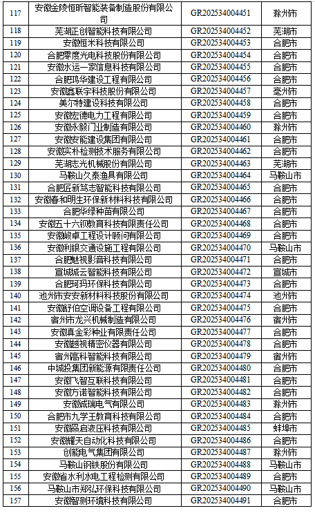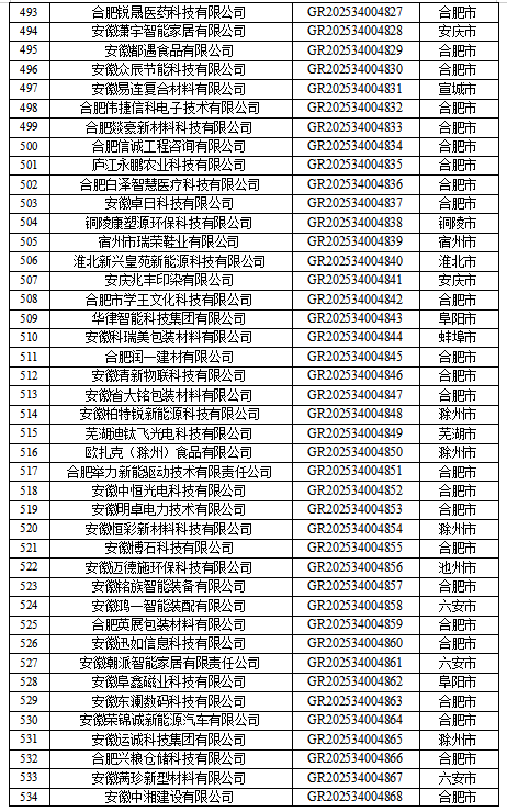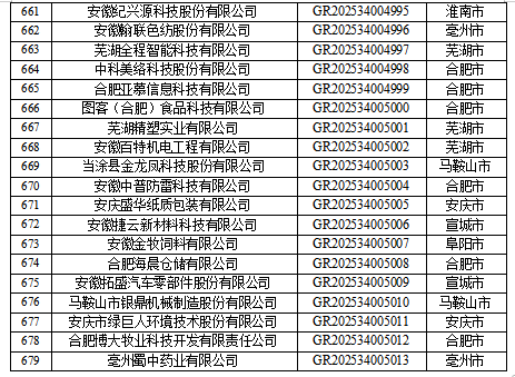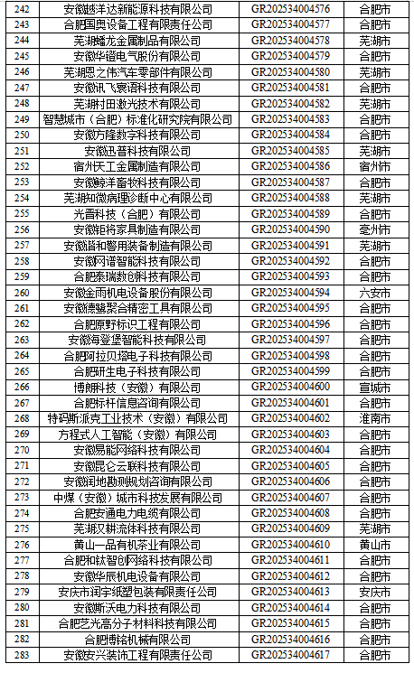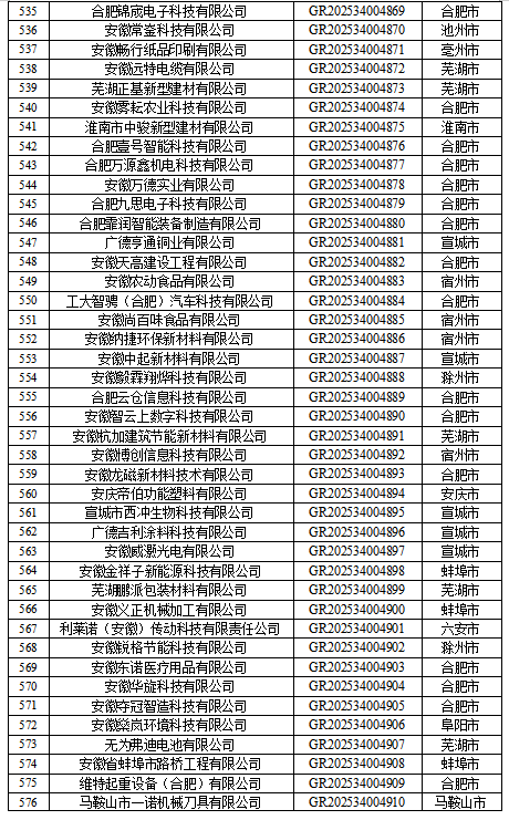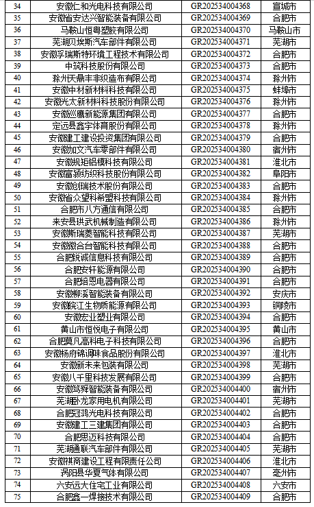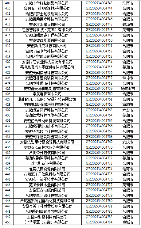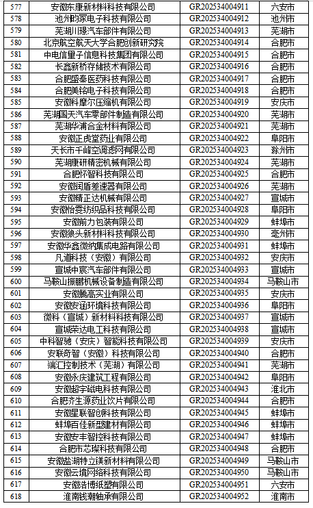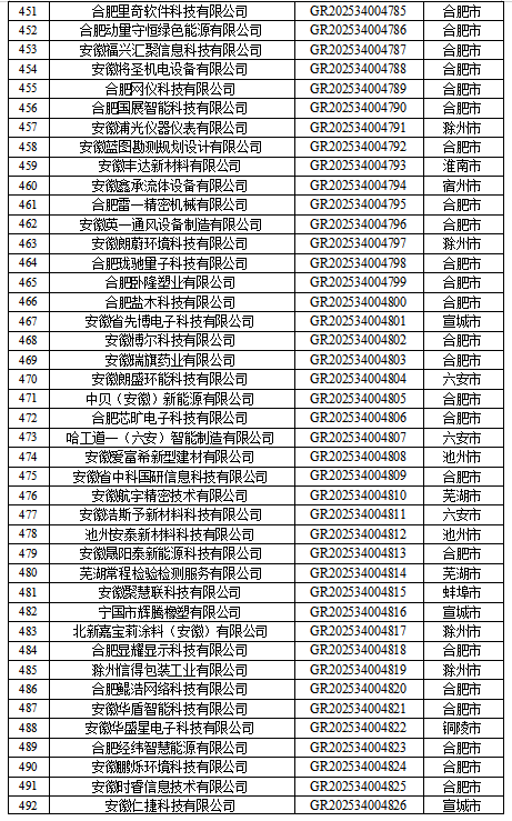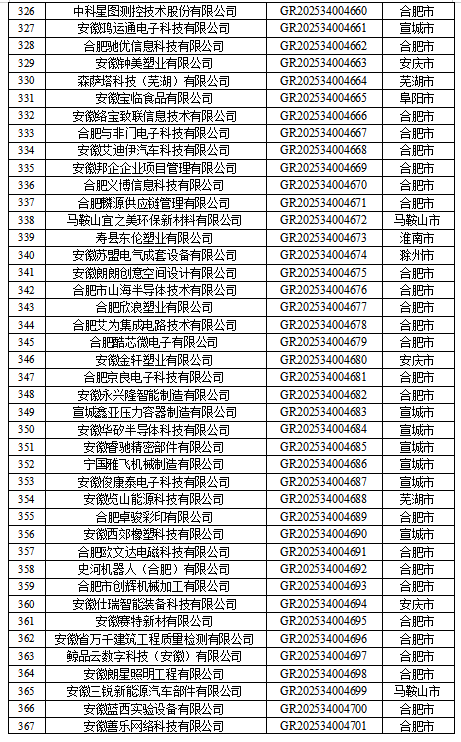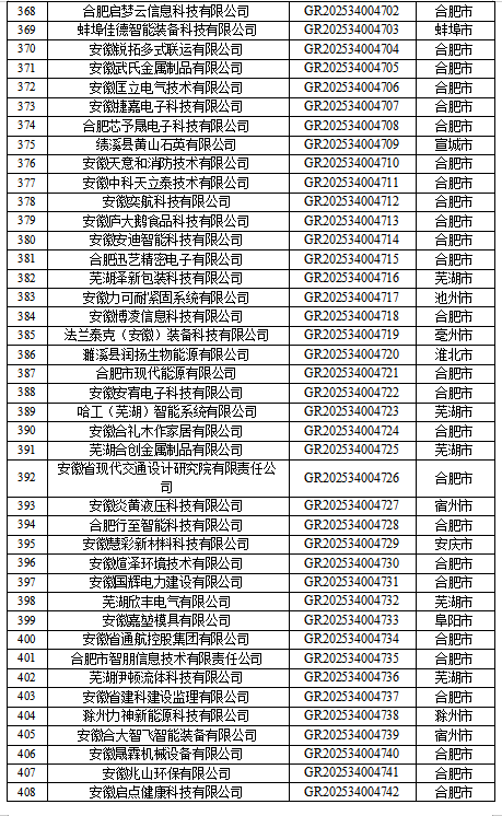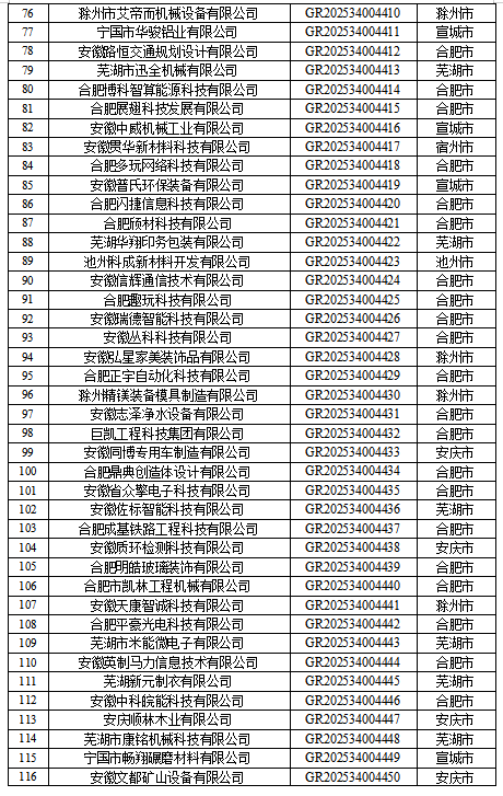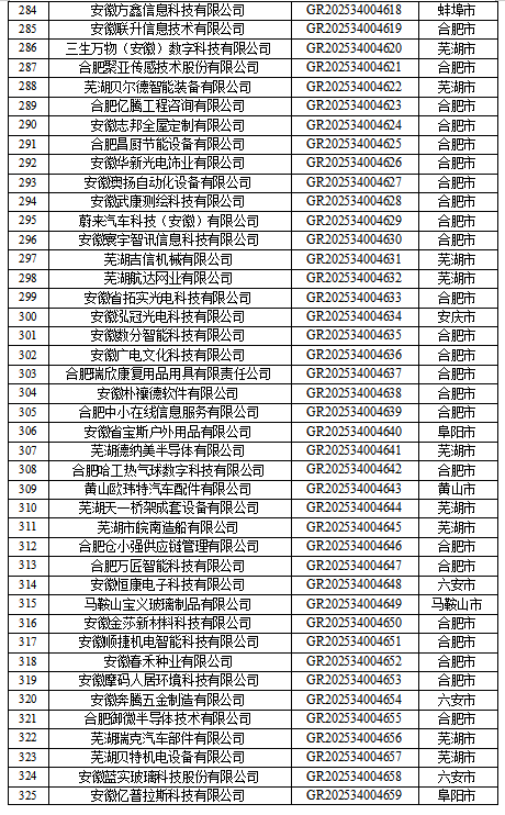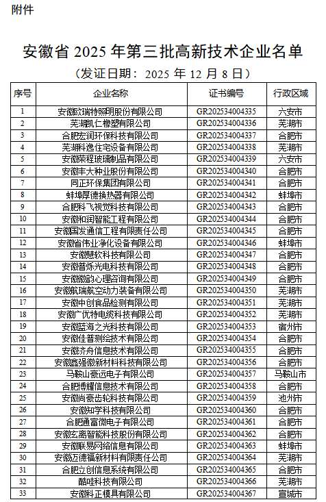 关于公布安徽省2025年第三批高新技术企业认定名单的通知各市科技局、财政局,国家税务总局安徽省各市税务局: 根据《高新技术企业认定管理办法》(国科发火〔2016〕32号)和《高新技术企业认定管理工作指引》(国科发火〔2016〕195号)有关规定,我省2025年第三批679家企业通过高新技术企业认定,现将名单予以公布。经认定的高新技术企业自2025年1月1日起享受国家高新技术企业所得税等优惠政策。 附件:安徽省2025年第三批高新技术企业名单 安徽省工业和信息化厅 安徽省财政厅 国家税务总局安徽省税务局 2026年1月4日 ![]() ![]() ![]() ![]() ![]() ![]() ![]() ![]() ![]() ![]() ![]() ![]() ![]() ![]() ![]() ![]() ![]() |